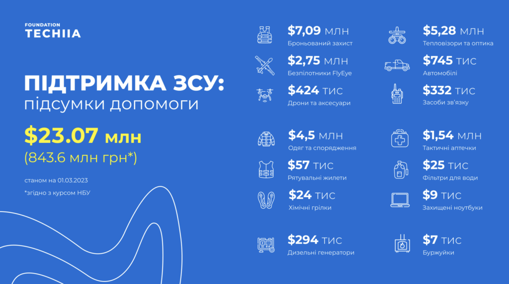 Станом на 1 березня 2023 року різні підрозділи Сил оборони України отримали від ГО “Фундація Течія” необхідних речей та засобів на $23,07 млн. Насамперед це бронежилети та шоломи, тепловізори та оптика, генератори та автівки, тактичний одяг і спорядження, дрони та звʼязок, тактична медицина та ліки.
