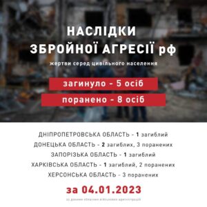 Жертви серед цивільного населення внаслідок збройної агресії РФ за 04.01.2023: