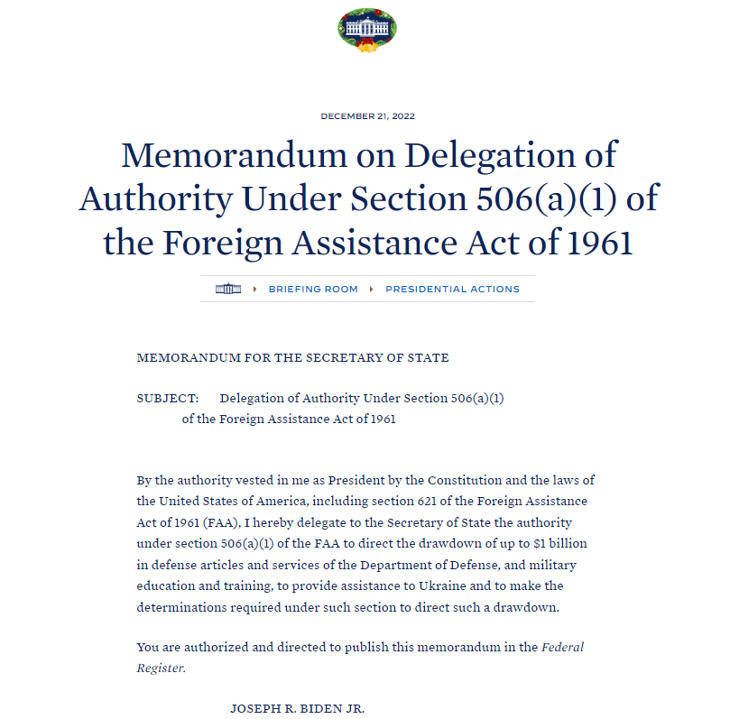 “Відповідно до повноважень, наданих мені як президенту Конституцією та законами Сполучених Штатів Америки, я делегую державному секретарю повноваження керувати вилученням до 1 мільярда доларів на предмети оборонного призначення та послуги Міністерства оборони, а також військову освіту та підготовку, щоб надати допомогу Україні та прийняти рішення, необхідні відповідно до такого розділу для спрямування таких просадка”, – йдеться в документі.