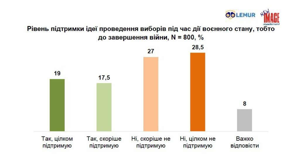 Ідею проведення виборів до завершення війни загалом схвалюють 36,5%: з них 19% цілком і 17,5% — скоріше підтримують. Проти загалом 55,5%: цілком не підтримують 28,5%, скоріше — 27%. Не змогли відповісти 8%.