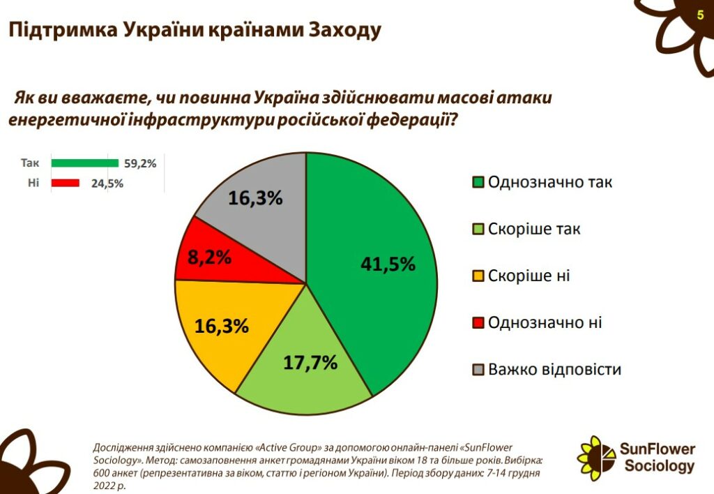 Так, відповідаючи на запитання “Як ви вважаєте, чи повинна Україна здійснювати масові атаки енергетичної інфраструктури російської федерації?”, то 59,2% відповіли ствердно, з них 41,5% однозначно за атаки на інфраструктуру рф, 17,7% скоріше згодні. Проте, чверть опитаних проти таких атак: 16,3% відповіли “скоріше ні”, а 8,2% однозначно проти таких атак. Не відповіли на запитання 16,3% опитаних.