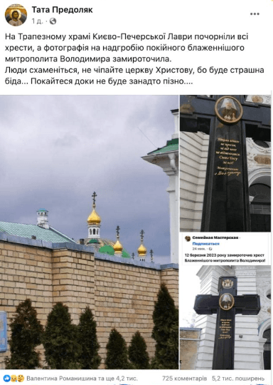 “Сьогодні навіть на Трапезному храмі потемніли хрести після “богослужінь” таких “великих” горе-українців”, − сказав він, після чого це поширили афільовані ЗМІ.