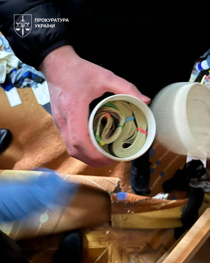 Серед вилученого – мічені купюри, передані як аванс у межах контролю за злочином. Походження коштів перевіряють, готують клопотання про арешт майна.