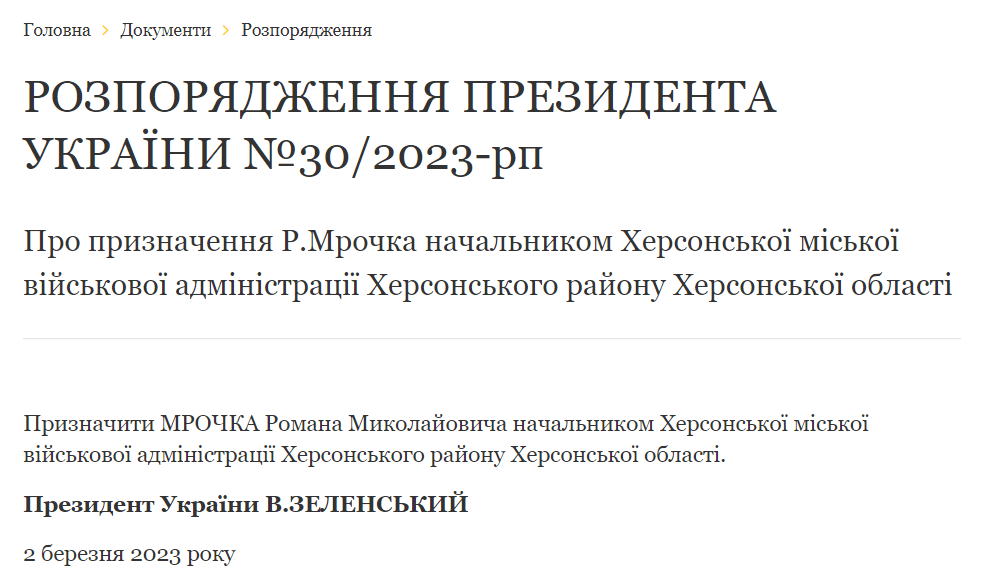 Іншим розпорядженням Зеленський призначив на посаду начальника Херсонської МВА Романа Мрочко.