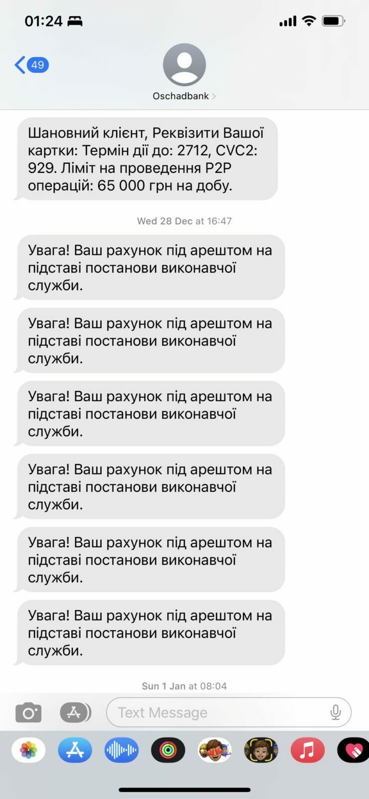 На фото, які оприлюднив Коболєв, видно смс-повідомлення за 28 грудня від Ощадбанку, у яких ідеться про те, що його рахунок перебуває під арештом на основі постанови виконавчої служби.