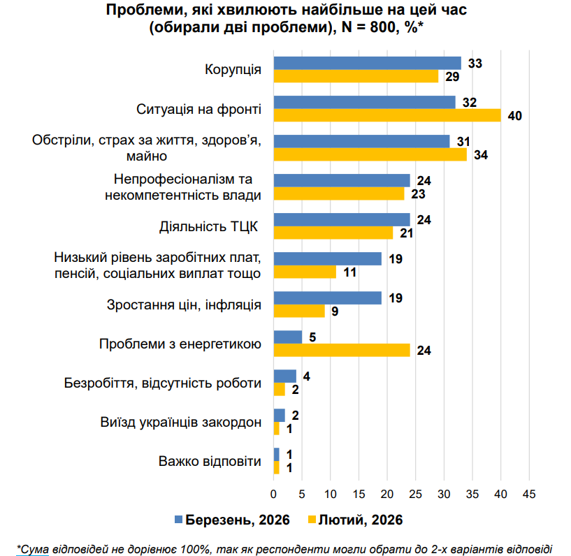 Перше місце посідає корупція – її назвали 33% (місяцем раніше було 29%). Далі йде ситуація на фронті – 32% (показник скоротився, в лютому було 40%). На третьому місці – обстріли, страх за життя, здоров’я, майно. Цей варіант вказали 31% (було 34%).