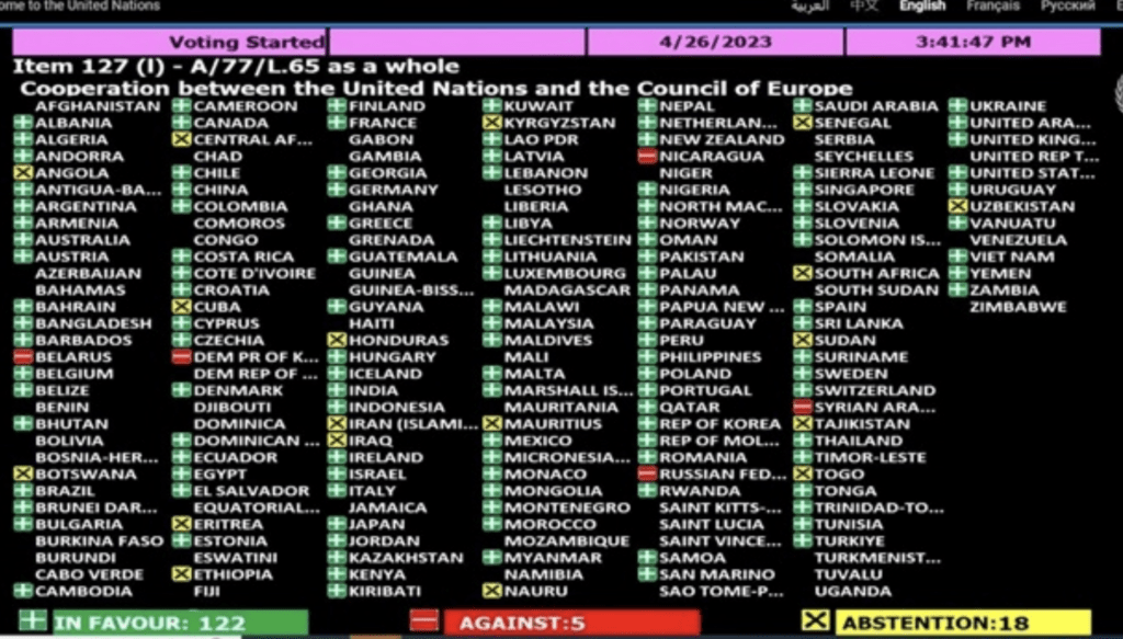 “Безпрецедентні виклики, які постали перед Європою після агресії Російської Федерації проти України, а до цього – проти Грузії, та припинення членства Російської Федерації в Раді Європи, потребують посилення співпраці між Організацією Об’єднаних Націй та Радою Європи, зокрема, з метою якнайшвидшого відновлення та підтримання миру і безпеки на основі поваги до суверенітету, територіальної цілісності та політичної незалежності будь-якої держави”, – підкреслюється в резолюції.