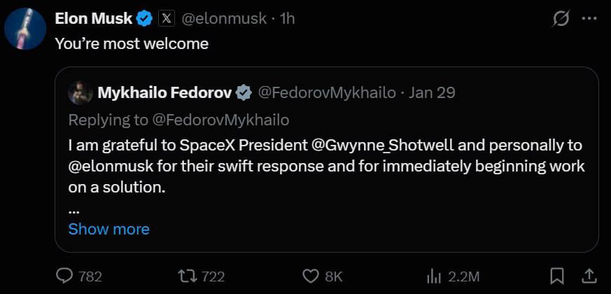 Федоров подякував керівництву SpaceX та Маску. У відповідь бізнесмен залишив короткий коментар у соцмережі X -“You’re most welcome”, що означає не просто “Будь ласка”, а радше “Радий допомогти”.
