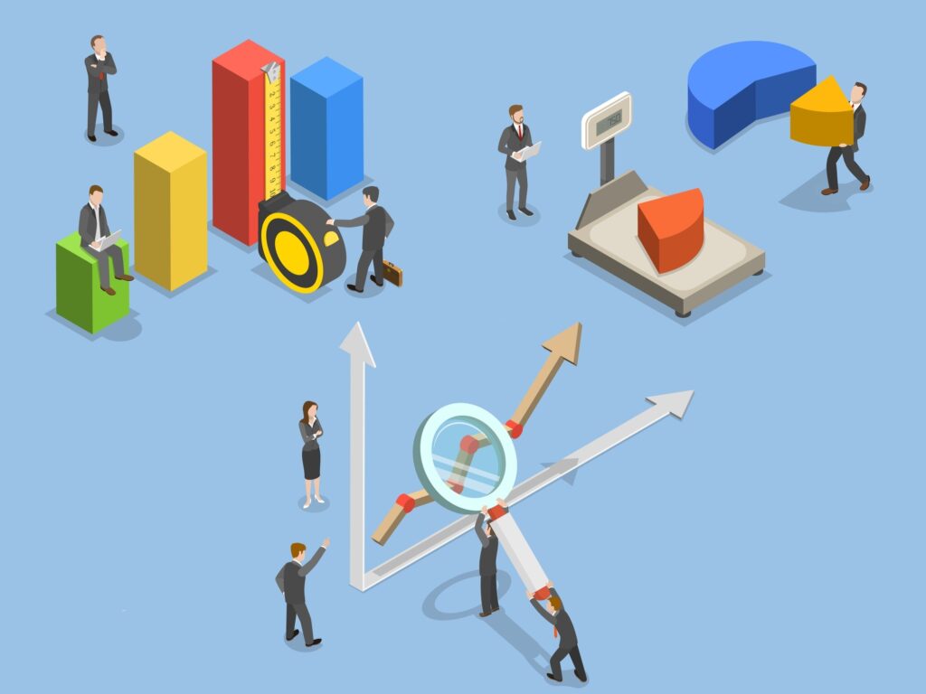 Business benchmarking flat isometric vector. Group of people are measuring company performance. S