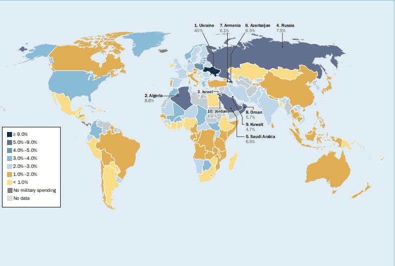 Окрім абсолютних показників, Україна має найвищу у світі частку оборонних витрат від валового внутрішнього продукту — близько 40%. Для порівняння, в Алжиру цей показник становить 8,8%.
