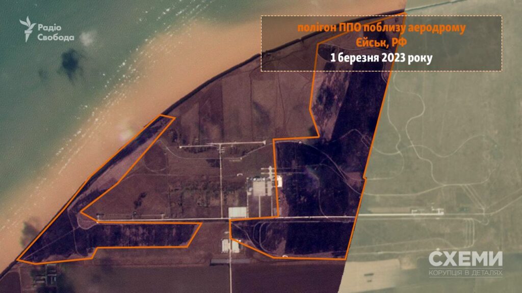 У розпорядженні журналістів “Схем” потрапили супутникові знімки Planet Labs за 1 березня, на яких можна побачити наслідки пожежі на території полігону протиповітряної оборони, що знаходиться західніше аеродрому.