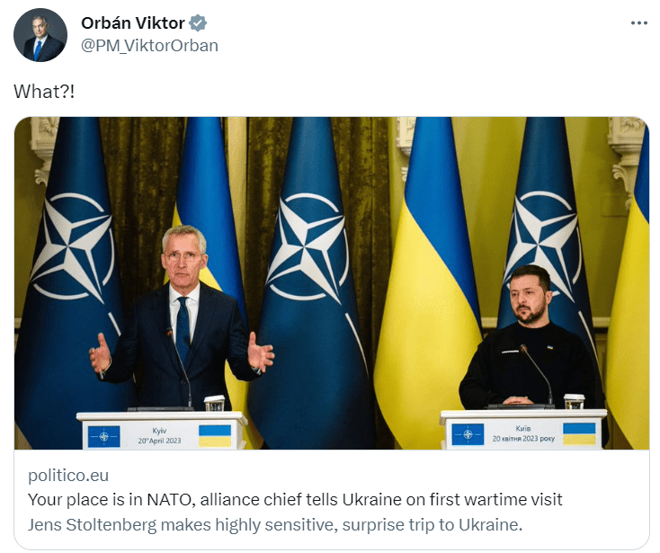 Орбан поширив публікацію видання Politico, де цитують слова Столтенберга на брифінгу у Києві: “Законне місце України – у євроатлантичній родині. Законне місце України – у НАТО. І з часом наша підтримка допоможе вам зробити це можливим”.