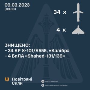 У Повітряних силах ЗСУ повідомили, що під час масованого обстрілу території України військові РФ випустили 48 ракет Х-101/Х-555, “Калібр”, засобами...