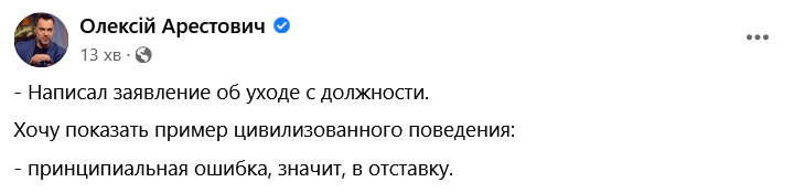 Позаштатний радник Офісу президента Олексій Арестович подав голові ОП Андрію Єрмаку заяву з проханням про звільнення з посади. Про це...