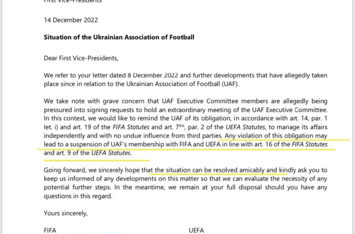 Міжнародна федерація футболу (ФІФА) та Спілка європейських футбольних асоціацій (УЄФА) попередили Українську всоціацію футболу (УАФ) про те, що в разі...
