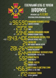 У Генеральному штабі ЗСУ оновили страти армії РФ у війні проти України, так за минулу добу, 14 грудня, було знищено...
