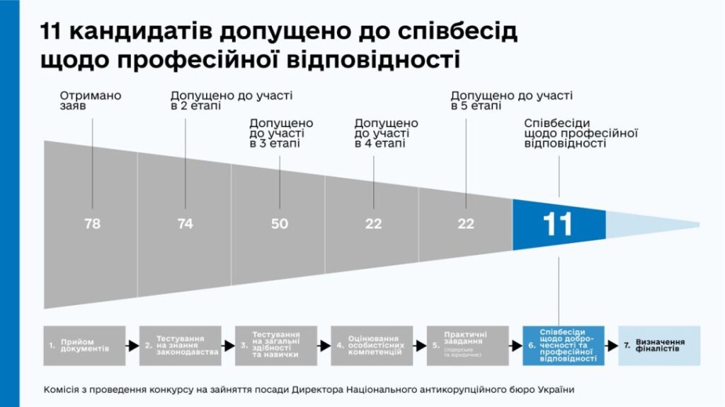 “Завдання комісії на фінальному етапі – всебічна оцінка професійного досвіду, мотивації, знань і рис кандидатів на посаду директора НАБУ та визначення трьох переможців конкурсу”, – наголосив голова комісії Микола Кучерявенко.