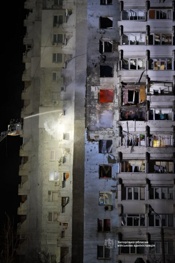У Запоріжжі після 02:30 пролунали вибухи, виникли пожежі та зафіксовано влучання у житлові будинки й об’єкти інфраструктури. Спочатку повідомлялося про поранених, однак згодом стало відомо, що внаслідок атаки загинула одна людина, ще п’ятеро отримали травми. У місті пошкоджено щонайменше шість багатоквартирних будинків, два приватні, магазин і промисловий об’єкт.