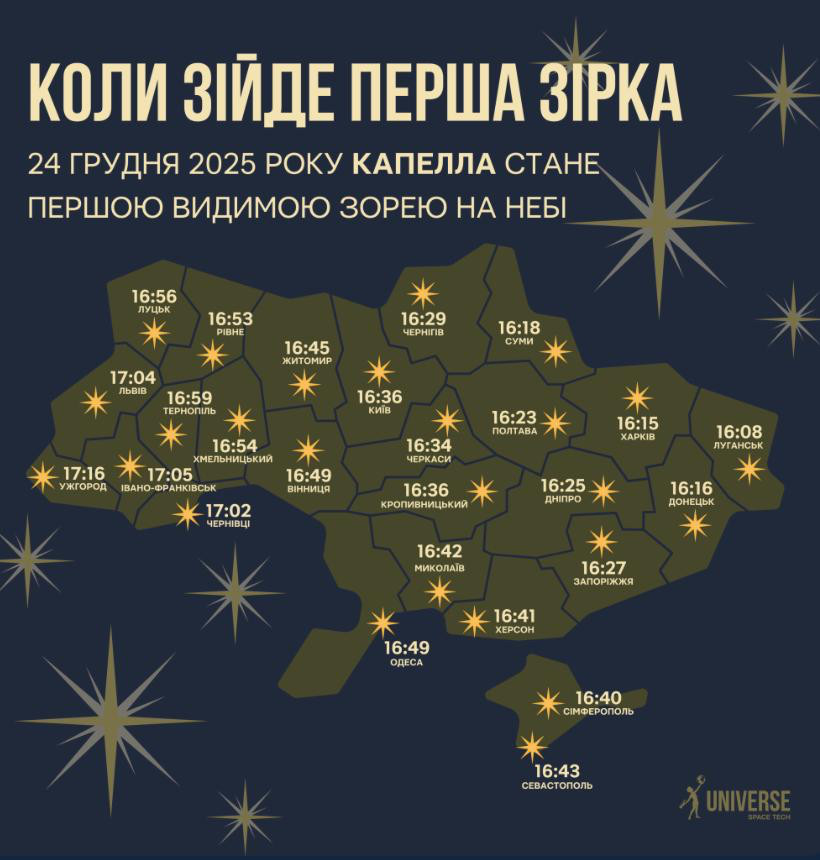 На Святвечір 24 грудня 2025 року над Україною з’явиться Різдвяна зоря, яка традиційно символізує початок святкування Різдва. Першою зорею цього вечора стане Капелла – одна з найяскравіших зірок зимового неба.