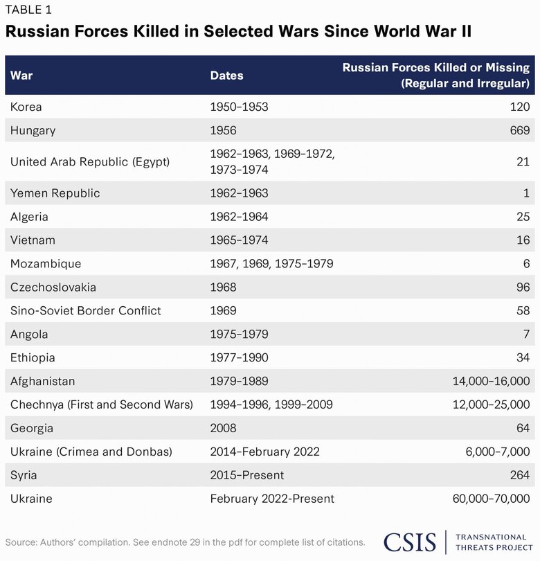 Зазначається, що найбільших втрат після закінчення Другої світової війни Радянський Союз зазнав у Афганістані – 14-16 тисяч. У Чечні російські втрати коливаються від 12 до 25 тисяч. З 2014 року і до повномасштабного вторгнення на Донбасі загинуло близько 6-7 тисяч російських військових.