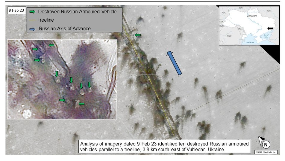 Міністерство оборони Великої Британії оприлюднило фотознімки із результатами боїв поблизу Вугледара Донецької області за ймовірної участі російських морських піхотинців. Розвідка королівства вважає, що росіяни зазнали там тяжких втрат.