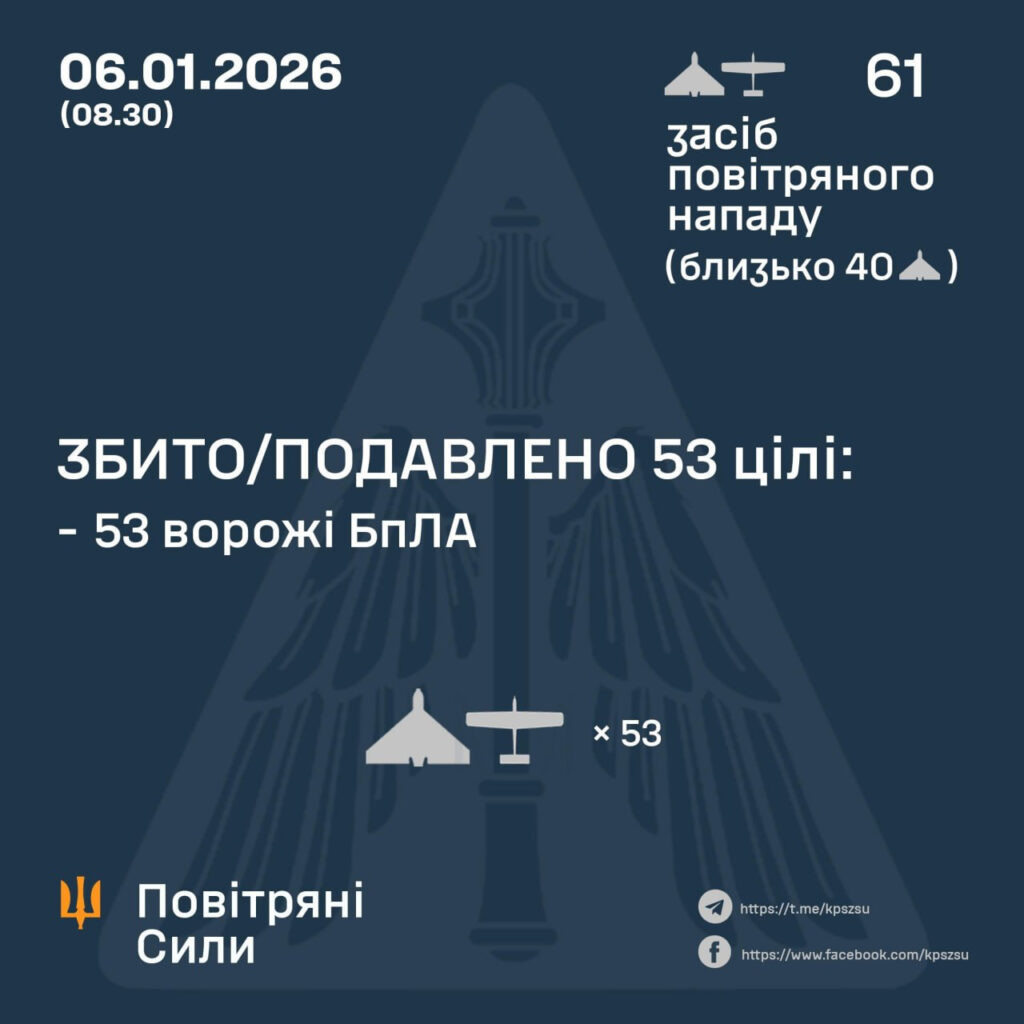 Станом на 08:30 сили ППО збили або подавили 53 ворожі безпілотники на півночі, у центрі та на сході країни. Водночас зафіксували влучання восьми ударних БпЛА на шести локаціях.