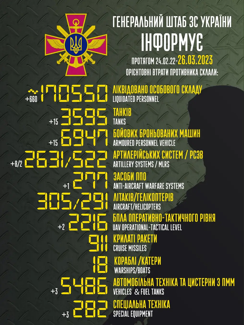 За повідомленням Генштабу загальні бойові втрати противника з 24.02.22 по 26.03.23 орієнтовно склали: