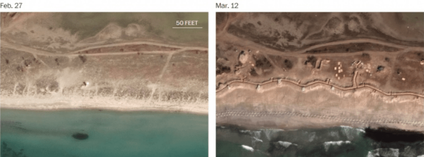 На знімку села Вітіно в Саакському районі Криму, зробленому 27 лютого, видно порожній берег. Проте вже 12 березня біля моря з’явилась лінія окопів. На одному із знімків, зроблених біля Вітіно, також видно кілька артилерійських установок, встановлених в окопах, що аналітикам важко пояснити з точки зору військової логіки.