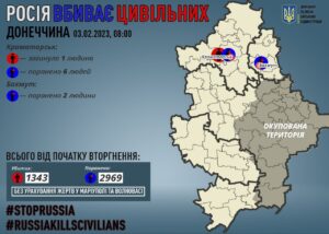 Голова Донецької обласної військової адміністрації Павло Кириленко повідомив, що за добу 2 лютого військові РФ вбили одного мирного жителя області, ще вісім зазнали поранень.