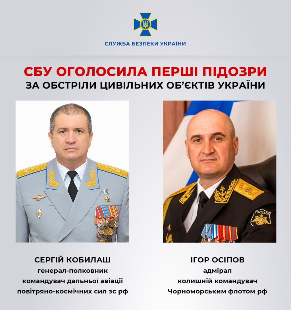 Служба безпеки України оголосила перші підозри за обстріли цивільних об’єктів України, зібрано докази на російського генерала та адмірала флоту РФ.