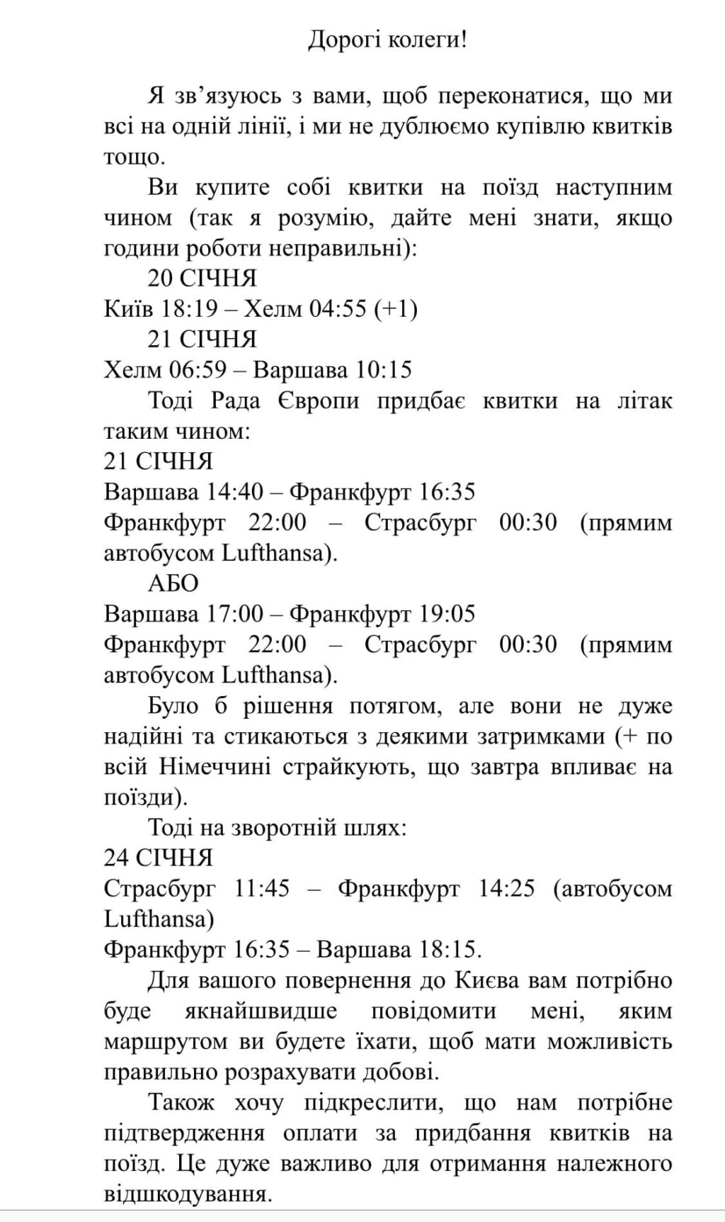Весь цей час в мене була щоденна переписка з представниками Ради Європи, які просили підтвердження щодо приїзду, бо інакше вони не можуть брати квитки і бронювати готелі. Я думаю, зайве казати, що ВСІ витрати були не за рахунок українського бюджету, а приймаючої сторони, це очевидно. За останні два роки ми ніколи не використовували бюджетні гроші на відрядження.