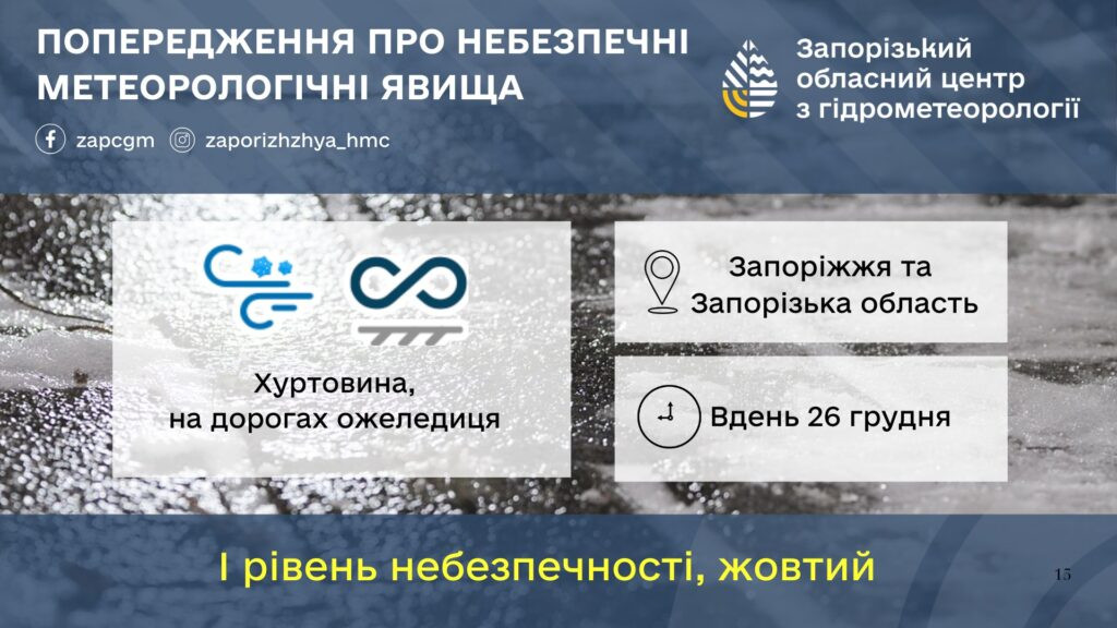 У Запорізькій області 26 грудня прогнозують погіршення погодних умов. Синоптики попереджають про сильний вітер, хуртовину та ожеледицю на дорогах.