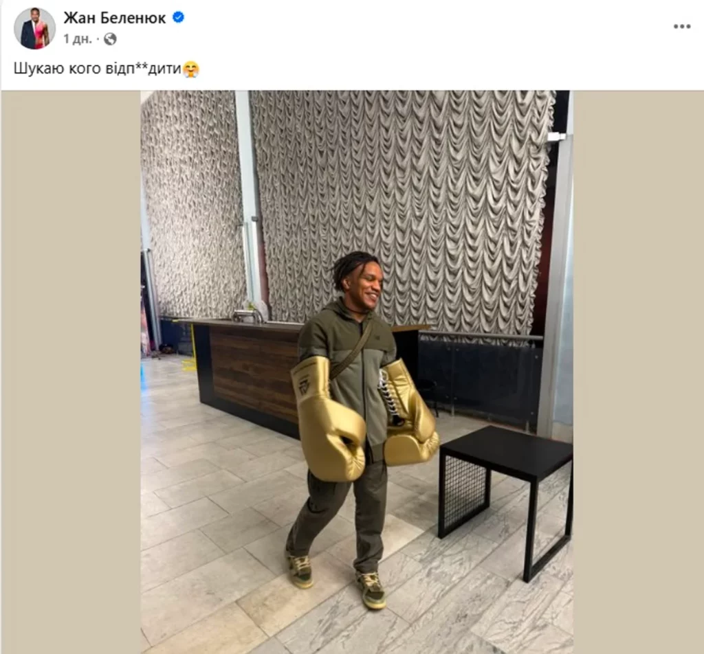 На своїй сторінці у Facebook спортсмен і політик виклав фото, на якому позує у велетенських золотистих боксерських рукавичках. Під знімком він написав коротко: “Шукаю, кого відп**дити”.