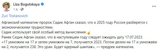 “Афганський математик-пророк Сідік Афган сказав, що до 2025 року Росія розбереться з економічними труднощами. Сідік використовує свій особливий метод обчислення. Раніше Сідік Афган сказав, що цього року слід очікувати дату 17.07.2023. “17 помножимо на 17 і потім помножимо на 7, виходить 2023. Потім ділимо на 17 і множимо на 2, виходить 238. Це уран. Буде ядерний шантаж”, – передбачив математик”, – пише Богуцька.