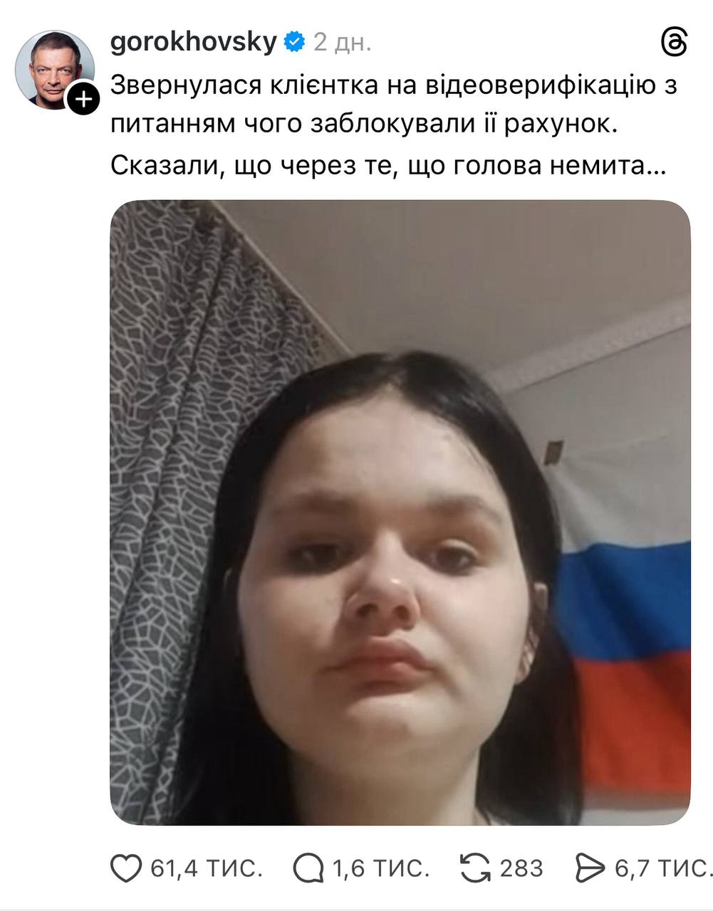 Днями у соціальній мережі Threads поширився допис співзасновника monobank, у якому він опублікував фото клієнтки банку, зроблене під час верифікації, на якому позаду дівчини видніється прапор схожий на російський.