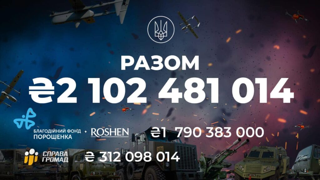 Фонд Порошенка та компанія ROSHEN від початку повномасштабного вторгнення станом на 1 лютого спрямували на підтримку Збройних Сил України 1 мільярд 790 мільйонів гривень, або 55 мільйонів доларів США (з урахуванням курсу на час платежів). Про це повідомляється на офіційній сторінці Фонду у мережі Facebook. Як відомо, Фонд Порошенка тісно співпрацює з волонтерами ГО Справа Громад, які окремо зібрали на потреби війська 312 098 014 гривень, або 8,67 мільйонів доларів США. Загальна сума допомоги ЗСУ, надана спільно з волонтерами ГО “Справа громад”, сягнула 2 мільярди 102 мільйонів гривень, або 63,67 мільйонів доларів США – йдеться у повідомленні Фонду Порошенка.