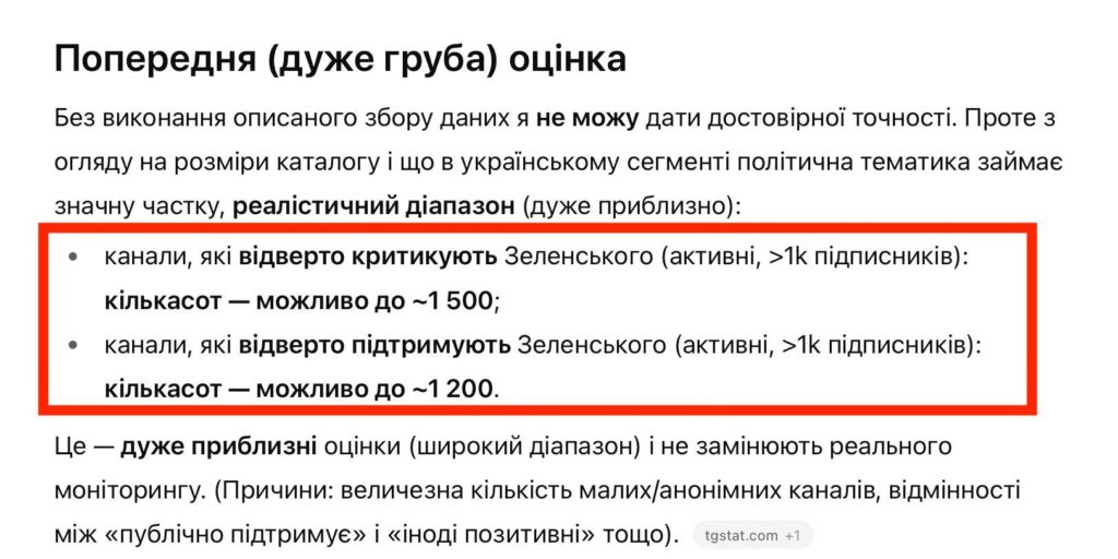 Просто поставте будь-якій мовній моделі питання на кшталт мого: “скільки існує Телеграм-каналів, які критикують президента Зеленського? І скільки існує Телеграм-каналів, які підтримують президента Зеленського?”