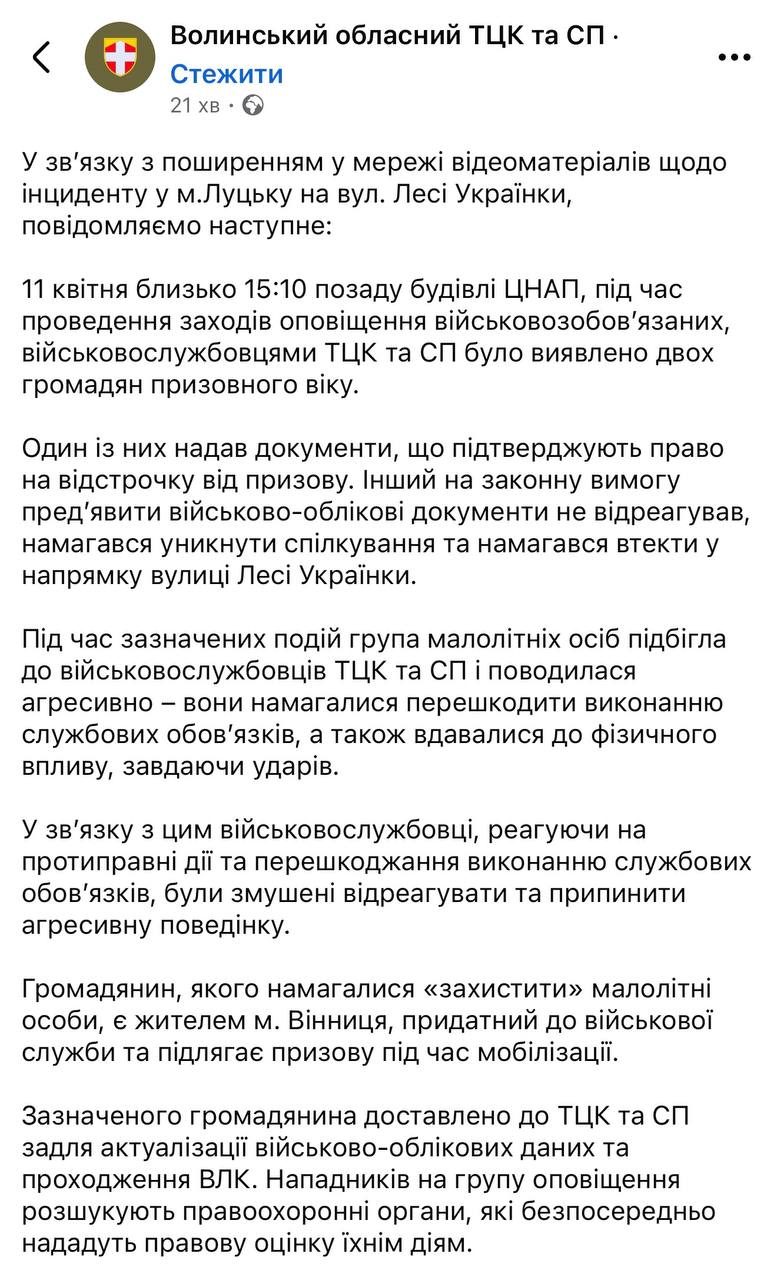 Як зазначається в офіційному повідомленні ТЦК, інцидент стався на це вулиці Лесі Українки, яка розташована у центрі Луцька. Біля будівлі ЦНАП представники ТЦК перевіряли документи. Один із чоловіків мав відстрочку. Інший відмовився показати документи та намагався втекти.
