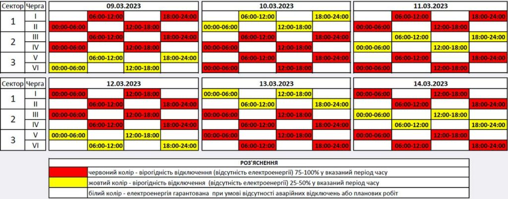 Якщо ваша адреса у вказаний період часу знаходиться у червоній зоні, то вірогідність відключення становить 75-100%. Якщо ваша адреса у жовтій зоні, то вірогідність відключення – 25-50%. У білій – електроенергія гарантована при умові відсутності аварійних відключень або планових робіт.