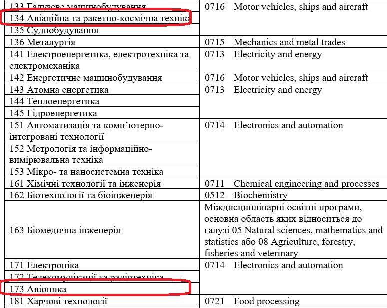 Так от, у розділі інженерних спеціальностей дивним чином зникла спеціальність 134 Авіаційна та ракетно-космічна техніка.