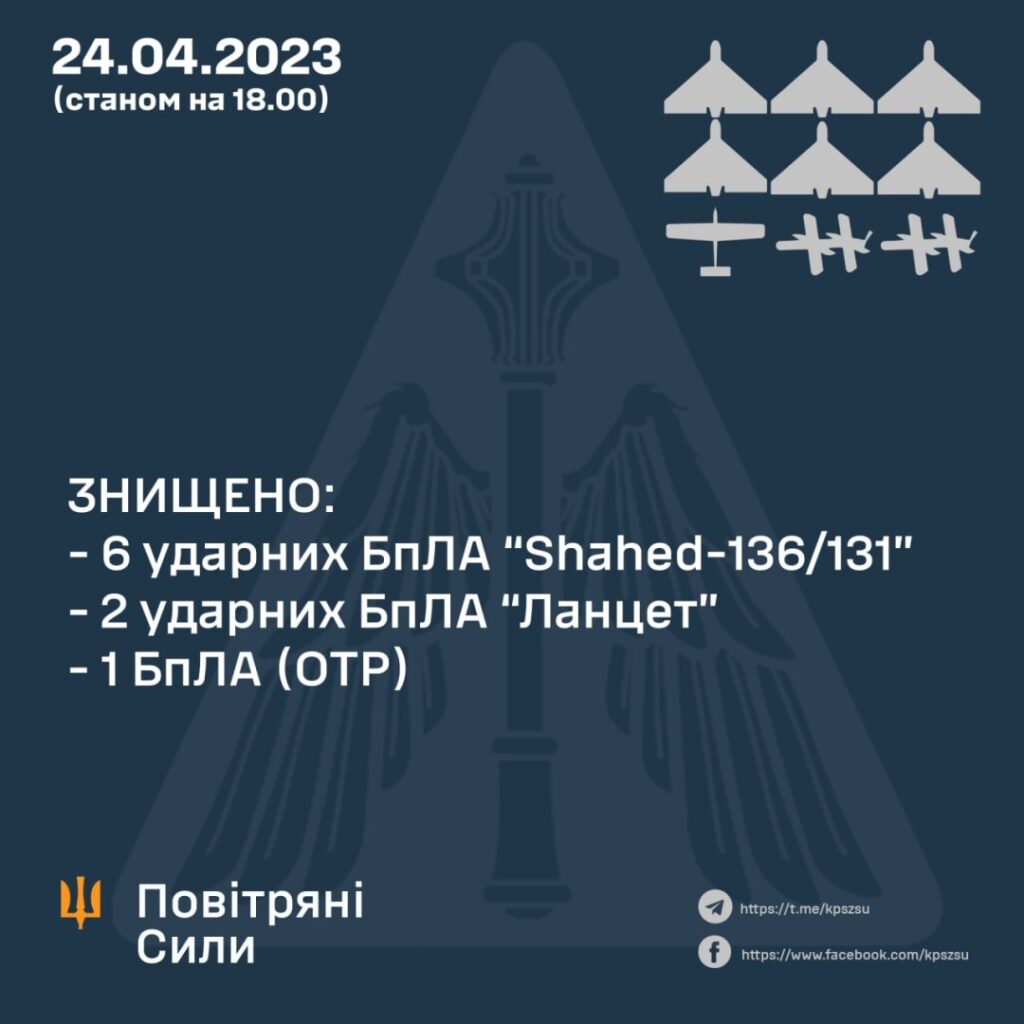 “Станом на 18:00 24 квітня знищено дев’ять ворожих БпЛА: шість ударних “Shahed-136/131” на східному напрямку – у зоні відповідальності повітряного командування “Схід” та три – у зоні відповідальності повітряного командування “Південь” – два ударних «Ланцет» і один БпЛА оперативно-тактичного рівня”, – йдеться в повідомленні Повітряних сил Збройних сил України.