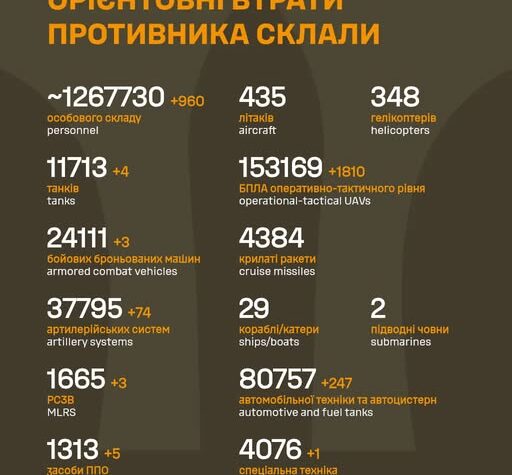 ЗСУ за добу знищили 960 окупантів та 74 артсистеми росіян