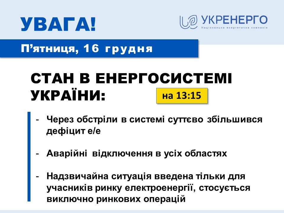 В “Укренерго” оголосили надзвичайну ситуацію. 16 грудня по всій території України діє режим аварійних відключень. Пріоритетно електроенергія буде подаватись на об’єкти критичної інфраструктури.