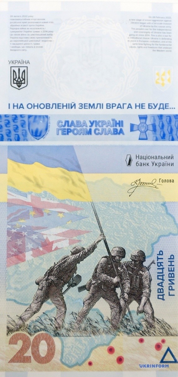 Пам’ятна банкнота “Пам’ятаємо! Не пробачимо!” номіналом 20 гривень вводиться в обіг 23 лютого 2023 року.