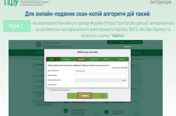 Крок 1: на вебпорталі Пенсійного фонду України авторизуйтесь за допомогою кваліфікованого електронного підпису або “Дія.Підпису” та натисніть кнопку “Увійти”.