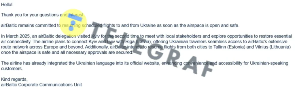 У латвійській авіакомпанії AirBaltic зазначили, що ключовою умовою відновлення рейсів залишається відкритий і безпечний повітряний простір над Україною.