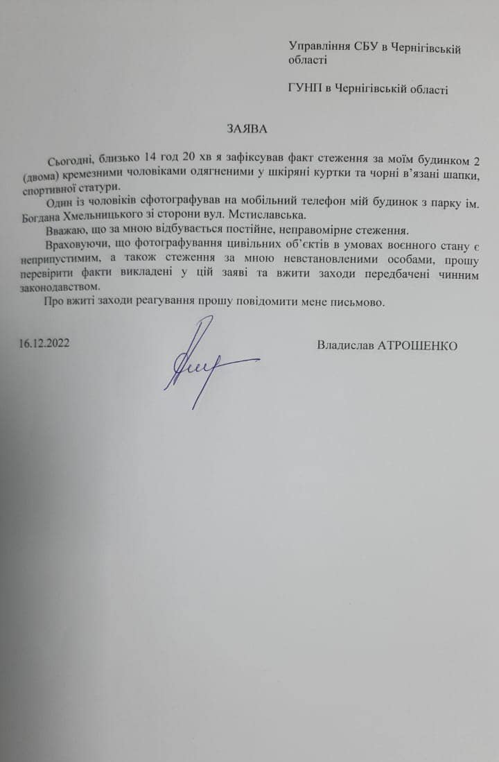 “Сьогодні, близько 14 год.20 хв. я зафіксував факт стеження за моїм будинком двома кремезними чоловіками, одягненими у шкіряні куртки та чорні в’язані шапки, спортивної статури. Один з чоловіків фотографував на мобільний телефон мій будинок з парку ім. Богдана Хмельницького зі сторони вул. Мстиславська. Вважаю, що за мною відбувається постійне, неправомірне стеження”, – зазначив Атрошенко.