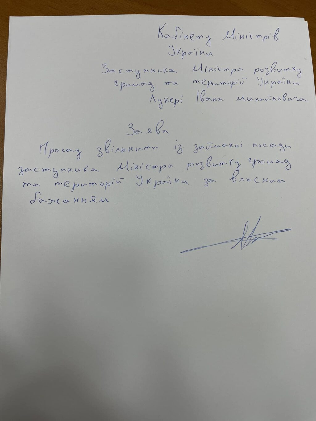 Заступник міністра розвитку громад, територій та інфраструктури Іван Лукеря подав у відставку.