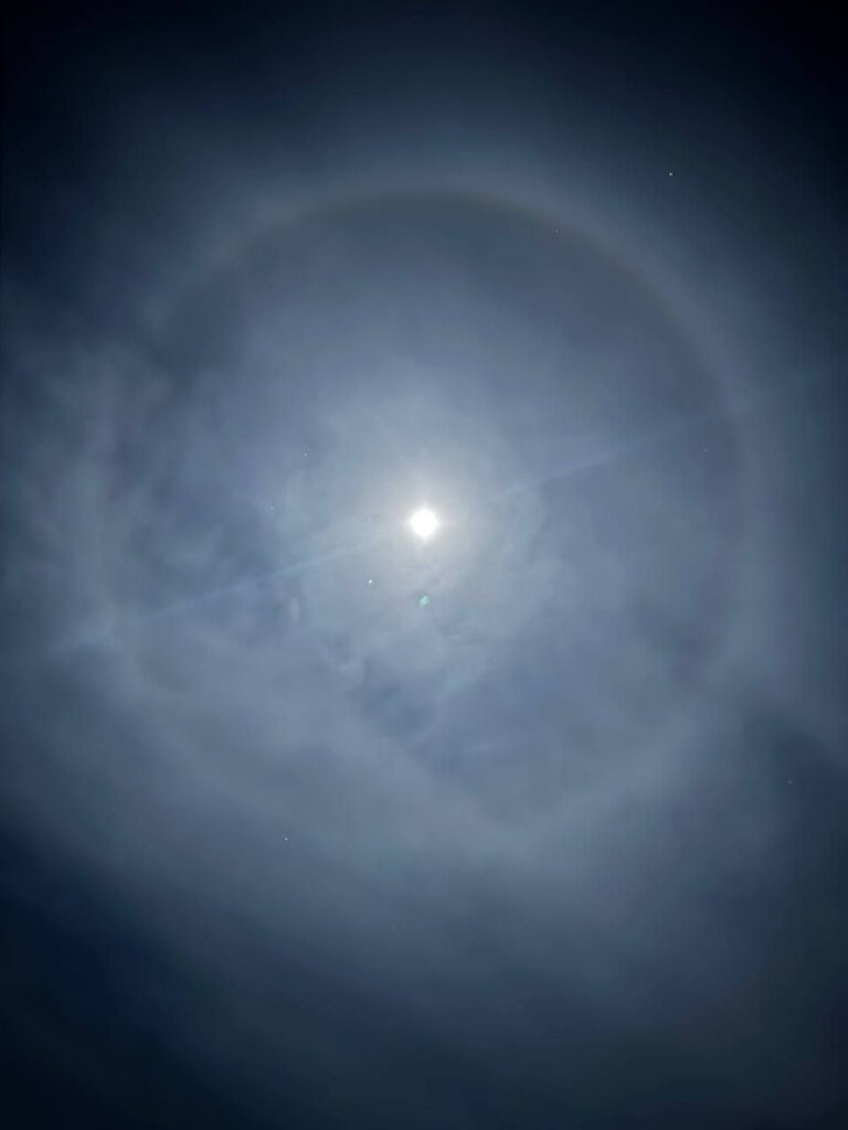 Місячне гало виглядає як велике яскраве кільце навколо Місяця. Воно виникає через заломлення світла в кристалах льоду, які перебувають у верхніх шарах атмосфери.