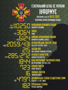 Загальні бойові втрати противника з 24.02.22 по 06.01.23 орієнтовно склали: